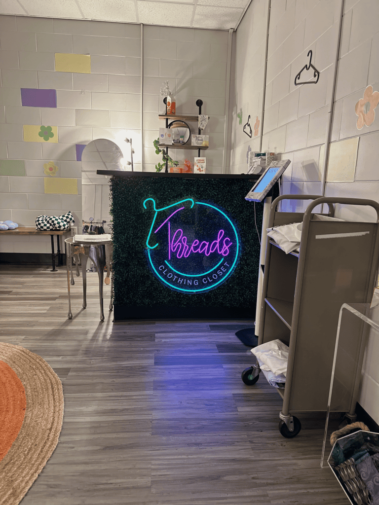 The staff at “Bergen Cares” has been resourceful with its donations to not only adequately supply the food pantry and “THREADS” closet but also to be intentional about the messaging in how participants experience the center. The clothing closet and food pantry are designed to resemble typical retail or grocery environments rather than traditional charity distributions to create a more welcoming and empowering experience for students, staff, and faculty. In addition, the neon store sign and the tagged clothing sans pricing are welcomed additions to resemble a boutique store experience. This approach helps to normalize the use of these resources and encourages students to feel comfortable utilizing them as needed.