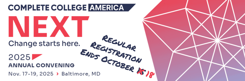 CCA has extended the regular registration deadline to October 18, giving you extra time to register at the $900 rate. After October 18, registration increases to $1,000. Register today at CompleteCollege.org/Next to be part of the conversation shaping the next era of higher education transformation.