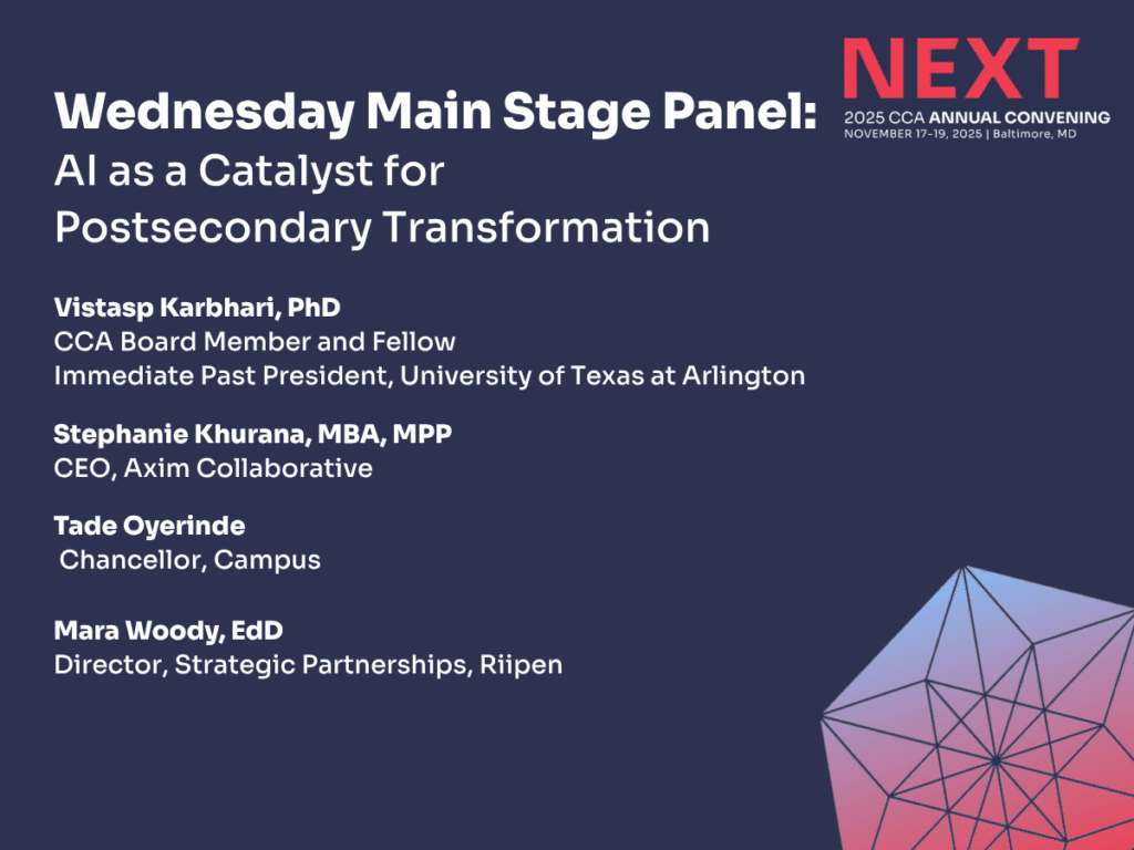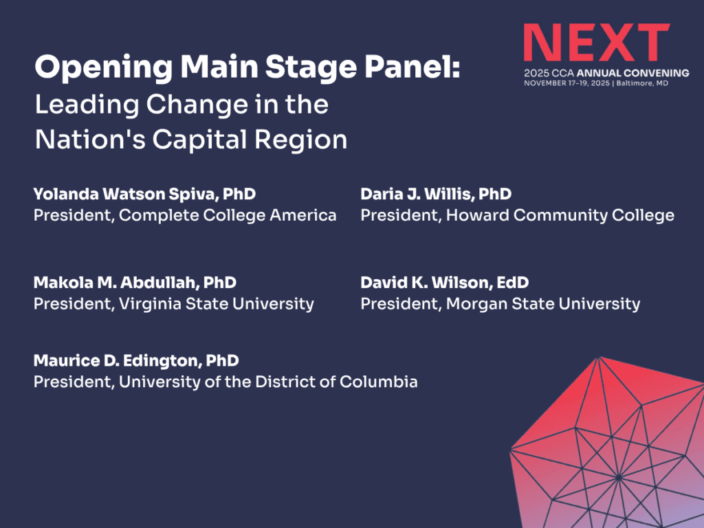Complete College America today announced two compelling main stage panel sessions for NEXT: The 2025 CCA Annual Convening, taking place November 17-19, 2025, in Baltimore, Maryland. These sessions, in addition to the previously announced keynote by Chike Aguh, bring together institutional leaders and innovators to address critical opportunities in higher education transformation.