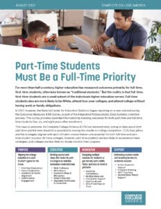 In addition to providing specific recommendations for shifts in on-campus support and institutional practice, the report calls on state and federal policymakers to prioritize investments in evidence-based programs to improve on-time completion for part-time learners and build new data systems to better measure and track the progress of part-time students.