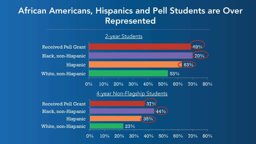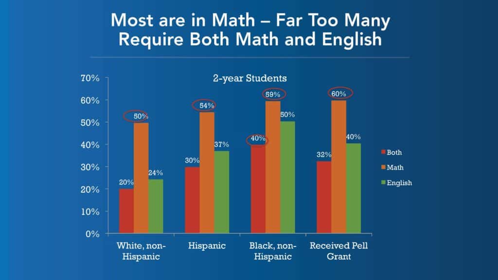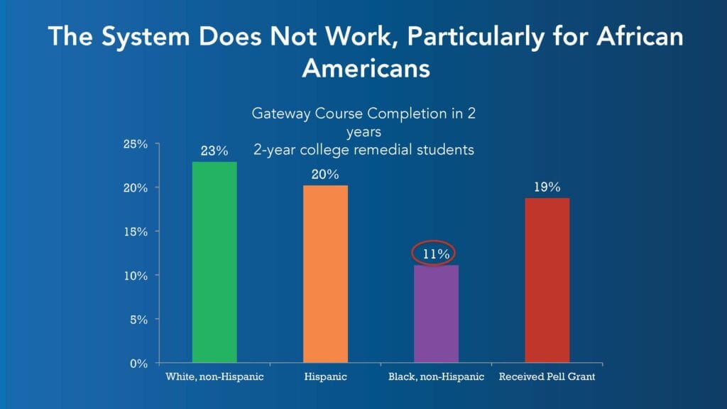 Not surprisingly, students of color and low-income students placed into remedial education are far less likely to complete their remedial education requirements, enroll in and complete college-level math courses within 2-years. Only 11% of African American students complete their gateway math and/or English course in two academic years after being placed in remedial education.