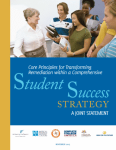 A joint statement on six core principles for transforming remediation. From Achieving the Dream, the American Association of Community Colleges, the Charles A. Dana Center at the University of Texas, Complete College America, Education Commission of the States, and Jobs for the Future.